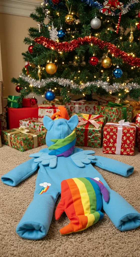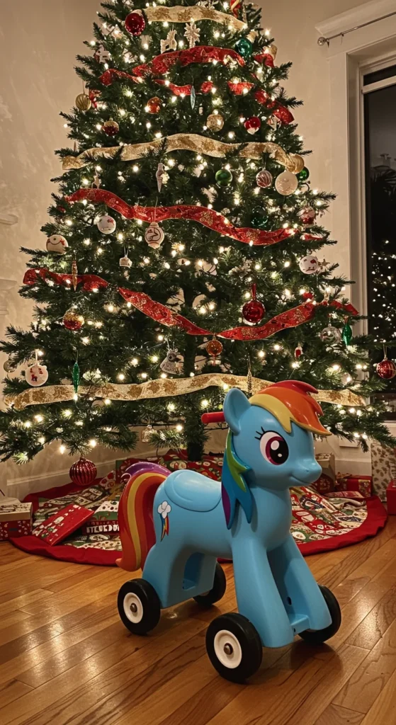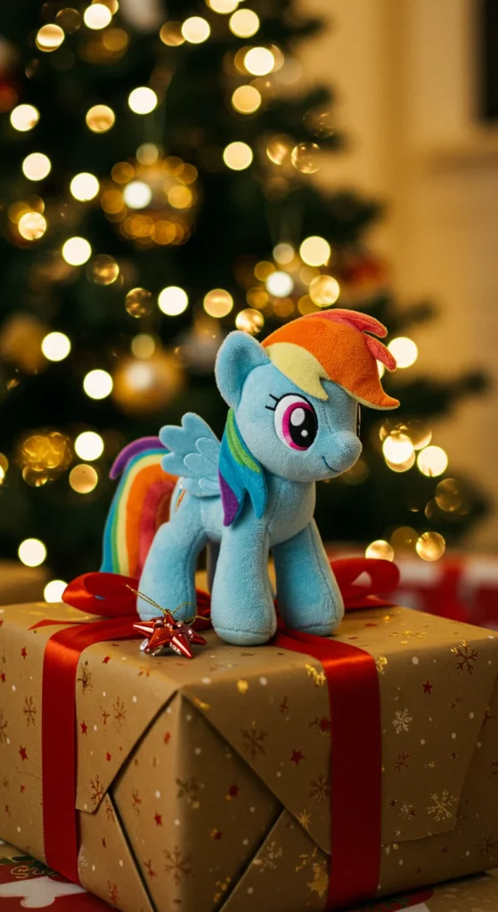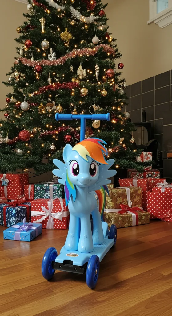 Ride-on toys bring energy and movement into play. A Rainbow Dash ride-on is designed for toddlers who enjoy scooting around. Parents can look for lightweight, budget versions. For a DIY option, decorate a plain ride-on with rainbow decals. This makes it feel special without overspending. Ride-on toys encourage balance and activity. They also look adorable parked by the tree on Christmas morning.