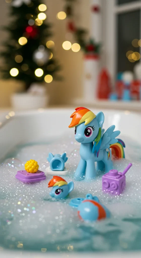 Bath toys make routine fun. A Rainbow Dash bath set often includes floating figures that squeak or squirt water. Parents love that they make bath time easier. These sets are inexpensive and easy to clean. A DIY option is to add rainbow-colored sponges or cups to bath play. Kids enjoy splashing around with their favorite character. Bath toys are cheerful and practical holiday gifts.