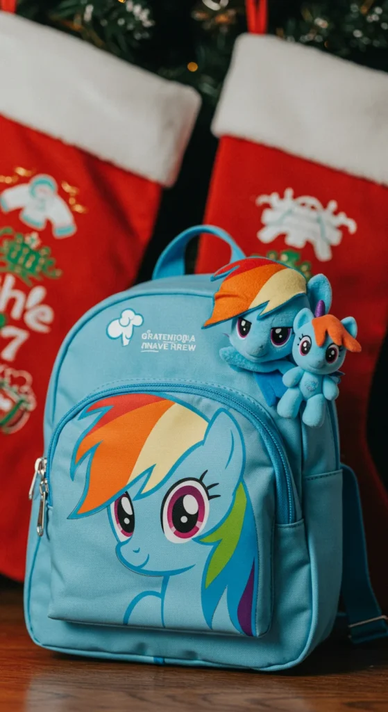 Backpacks make gifts both fun and useful. A Rainbow Dash backpack often comes with a small plush or figure inside. Parents like that it doubles as storage for toys. For a DIY version, add a toy to a plain rainbow backpack to personalize it. Kids love carrying their favorite character wherever they go. Backpacks with toys are affordable and practical holiday surprises.