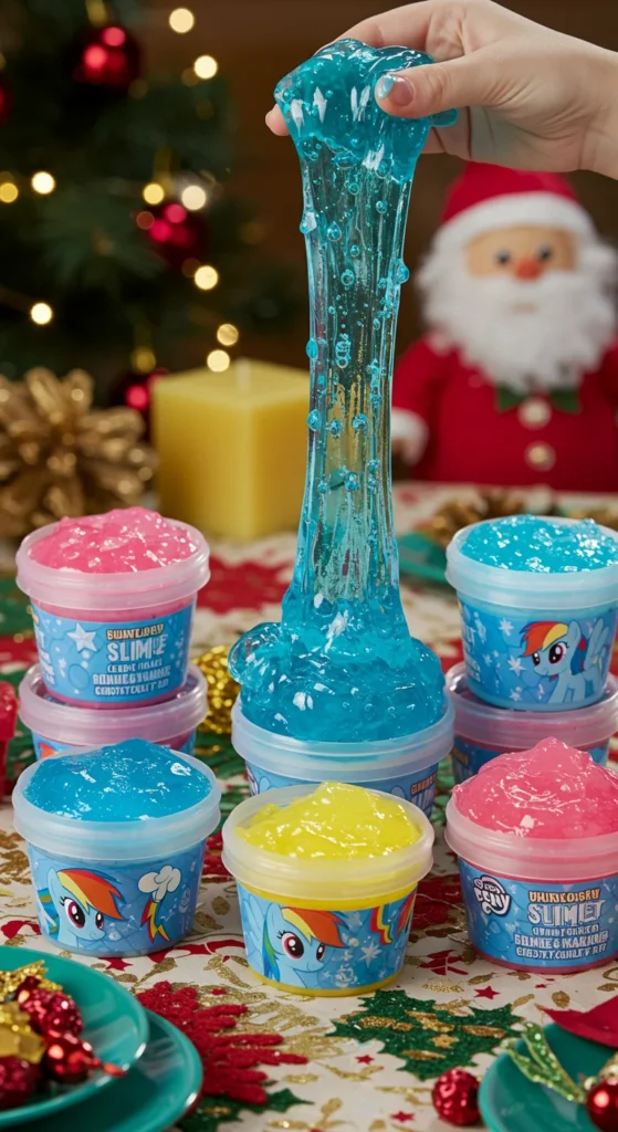 Slime kits are exciting for hands-on play. A Rainbow Dash slime kit includes colorful mixes that sparkle with rainbow shades. Parents can find affordable sets online or in toy stores. A DIY version involves making slime at home with glue, baking soda, and food coloring. Kids enjoy stretching, squishing, and shaping the slime. These kits make great group activities during holiday gatherings.