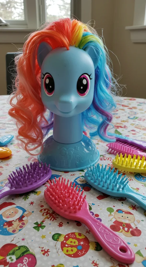 Styling heads make play interactive. A Rainbow Dash version comes with colorful hair to brush and style. Parents can find budget-friendly sets that include clips and combs. A DIY touch is to add extra rainbow ribbons from craft stores. Kids enjoy creating hairstyles again and again. Styling toys combine fashion play with imagination, making them a hit during the holidays.