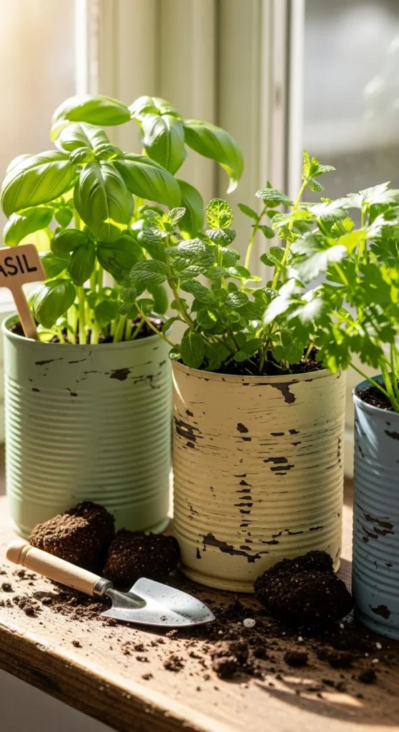 Old food cans make excellent mini planters because they are sturdy, easy to clean, and simple to decorate. Wash each can well, peel off the label, and sand any rough edge. Paint the outside in soft colors, wrap twine around the middle, or glue on fabric scraps for a warmer look. Add a few holes in the bottom if you want real drainage, then fill the can with potting soil and easy herbs like mint, basil, or coriander. If you do not want to deal with soil, you can place a small plastic nursery pot inside the can and still get the same look. This idea works especially well for kitchen windows, balconies, or sunny shelves. It is also a cheap way to make a matching set of planters without buying ceramic pots. A few recycled cans on a tray can look neat and handmade at the same time. For a gift idea, make a set of three and tie them together with string. This craft is simple, practical, and a great way to start using waste in a more creative way.