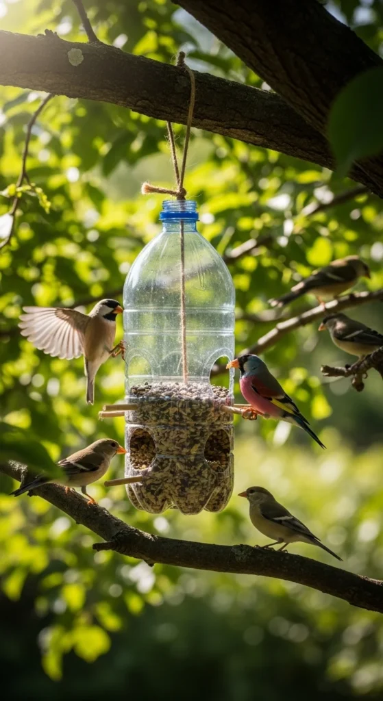 Plastic bottles can become simple bird feeders with just a few cuts and a bit of string. Wash the bottle well, cut small openings for the birds, and slide wooden spoons or sticks through the bottle to act as perches. Fill it with birdseed and hang it from a tree, balcony, or garden hook. This is a lovely low-cost craft because it turns packaging waste into something that supports backyard wildlife. It is especially fun for children because they can watch birds come and go after making the feeder. To make it look nicer, paint only the outside sections that do not block the seed level, or wrap twine around the top for a natural finish. Large soda bottles or smaller water bottles both work, depending on the size you want. The project is simple enough for beginners and useful enough to feel worth the effort. It adds life to outdoor spaces and gives a plastic container a new purpose before it is thrown away.