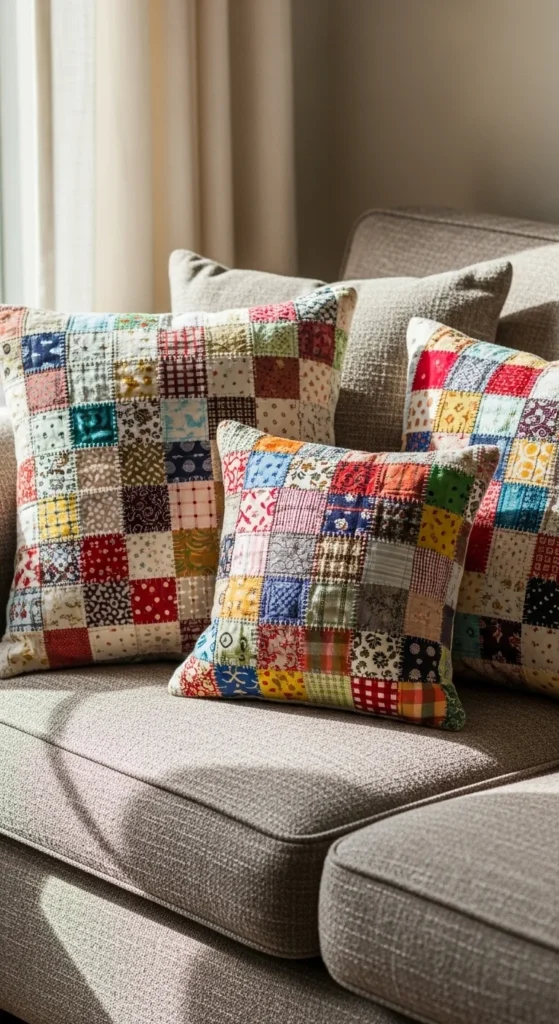 Scrap fabric from old clothes, curtains, or sewing leftovers can be turned into patchwork pillows that add color without costing much. Cut the fabric into squares or simple shapes, arrange them in a pattern, and sew or glue them onto a backing piece. Then turn the front into a pillow cover or stuff it lightly for a small cushion. This craft is a nice way to save sentimental pieces from clothing that you do not want to wear anymore but do not want to throw away either. A child’s old shirt, soft flannel, or floral cotton all work beautifully in patchwork. You do not need perfect sewing skill for this to look charming. Small uneven details often add to the handmade look. Budget wise, it is far cheaper than buying decorative pillows, especially if you already own the fabric and stuffing. You can even fill the cushion with soft fabric scraps instead of new stuffing. It is warm, practical, and gives unused textiles a second role in your home.