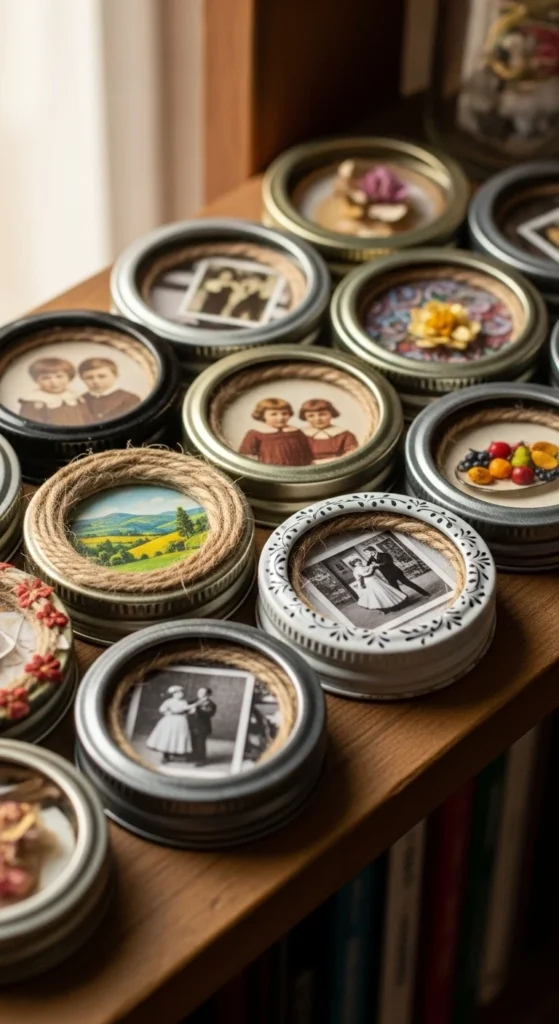 Jar lids are great for mini photo crafts because their round shape already feels like a tiny frame. Clean the lid, place a small printed photo inside, and glue a backing behind it to hold everything in place. You can leave the metal plain, paint it, or decorate it with ribbon, beads, or twine. Add a magnet to the back for the fridge, or glue on a loop so it can hang on a wall or gift bag. This project is simple, low-cost, and a good way to use very small favorite photos that may otherwise sit in a drawer. It also works well for memory gifts, holiday keepsakes, or party favors. Because the size is small, you can finish several in one sitting without needing many supplies. Matching painted lids can look especially sweet grouped together. Recycled photo crafts like this feel personal and meaningful while using something that usually gets ignored. It is a lovely way to turn packaging parts into tiny pieces of home decor.