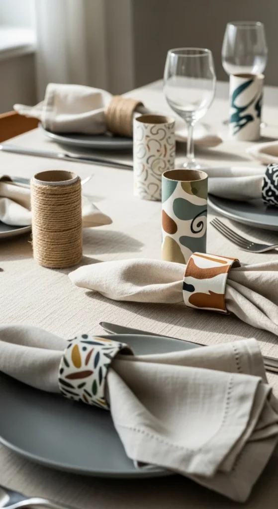 Cardboard tubes from paper towels or foil rolls can be cut into small rings and turned into easy table decor. Slice the tube into even sections, then wrap each ring with twine, ribbon, fabric strips, or painted paper. You can keep them plain for a rustic table or decorate them to match birthdays, family dinners, or holiday meals. This project is fast, cheap, and useful, which makes it a good craft when you want something practical instead of purely decorative. It is also easy to personalize. Neutral tones feel calm and simple, while colorful wraps make the table more playful. These napkin rings store easily and can be reused again and again. If you host meals often, making your own set saves money compared with buying table accessories. Kids can help decorate them, which adds a homemade touch to family gatherings. It is a small recycled craft, but one that shows how ordinary paper waste can become part of a nicer table setting with very little effort.