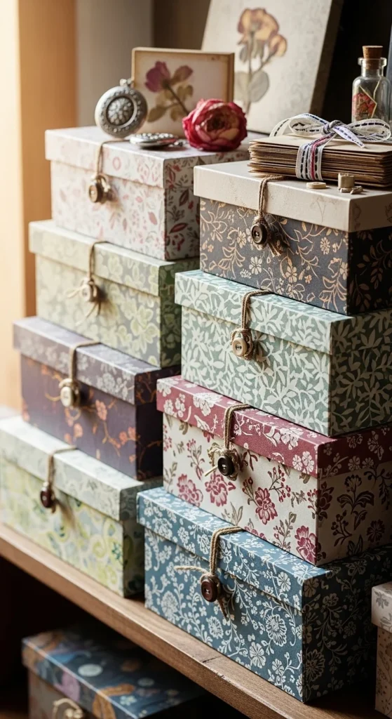 Shoe boxes are sturdy and roomy, so they make excellent storage cases for photos, letters, art supplies, toys, or keepsakes. Cover the outside with wrapping paper, old maps, wallpaper scraps, or fabric to hide the brand print and give the box a cleaner look. You can add handles made from ribbon or label tabs if you want it more organized. This is a very budget-friendly way to create matching storage for closets, shelves, or under-bed spaces without buying bins. It is especially useful in bedrooms and playrooms where small things tend to scatter. Kids can decorate their own memory box with stickers and painted details, while adults might prefer a calmer paper pattern for office or closet storage. A well-covered shoe box can look surprisingly neat on an open shelf. Reusing packaging in this way keeps useful containers out of the trash and helps you tidy the house at the same time. That mix of function and creativity is what makes recycled crafts so satisfying.
