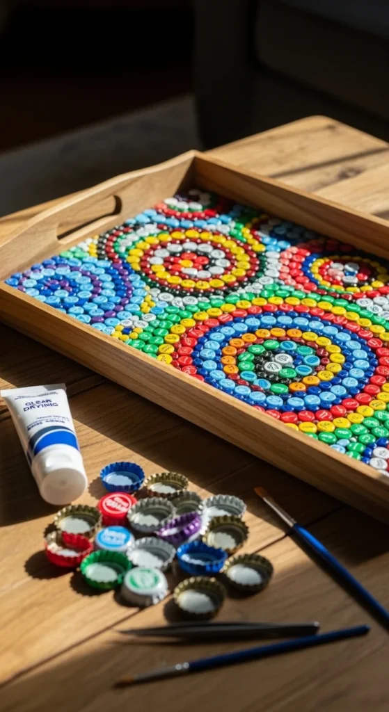 Bottle caps can also be used in larger projects, and one of the most eye-catching is a mosaic tray. Start with an old tray, shallow lid, or flat wooden base. Arrange clean bottle caps in a pattern, mixing colors as you go, then glue them down firmly. You can keep the design random for a playful look or sort by shade for something more planned. Once dry, the tray can hold candles, small plants, keys, or craft tools. This is a good project for families because everyone can help collect caps and arrange the design. It also gives you a chance to use repeated materials in a more artistic way. The cost stays low because the main decorative element is free. If the tray itself is old or scratched, the caps hide a lot of wear. Recycled mosaic crafts feel cheerful and bold, and they make a fun statement on shelves or tables. It is a clever way to turn tiny throwaway pieces into a colorful home accessory.