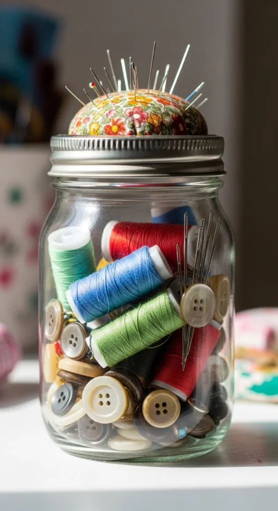A glass jar can become a tidy little sewing kit with almost no cost. Fill the jar with thread, buttons, pins, and spare needles, then glue a small stuffed fabric cushion on top of the lid to create a built-in pin holder. This makes the jar both storage and workspace, which is especially useful if your sewing supplies are always scattered in different drawers. Jam jars or small sauce jars work well because they are compact and easy to carry from room to room. You can decorate the lid fabric with a simple pattern that matches your craft corner, or keep it plain for a cleaner look. The charm of this project is how practical it feels once finished. Instead of buying a plastic sewing box, you can reuse a container you already own and make it look warm and handmade. It is a smart recycled craft for beginners because it is easy, useful, and helps organize other supplies too.