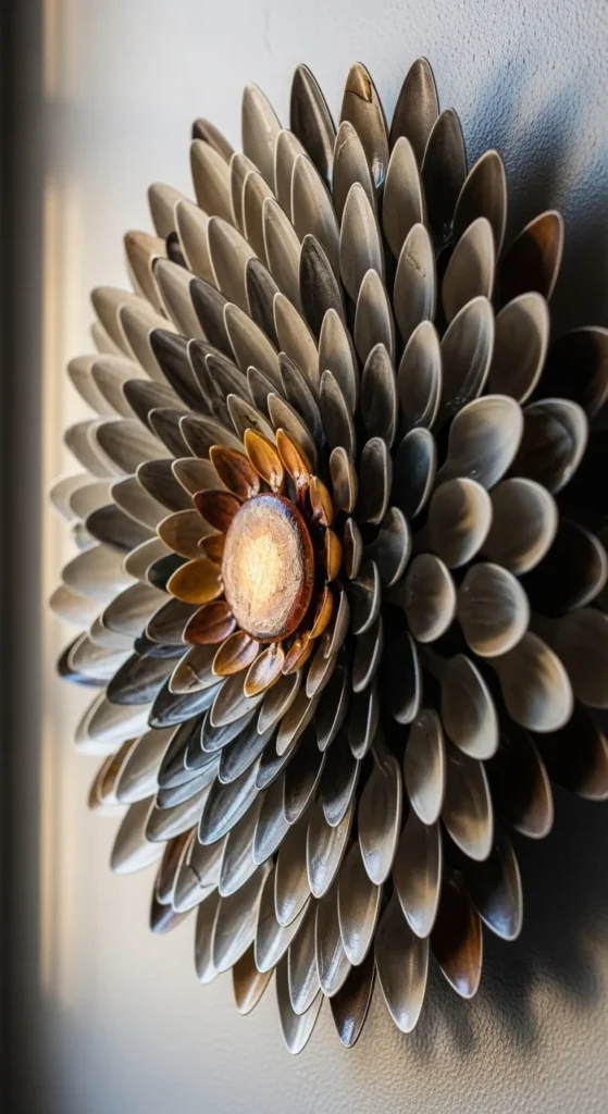 Plastic spoons can be turned into decorative flowers by cutting off the spoon heads and layering them in a circular pattern. Glue the pieces around a cardboard base, paint them once dry, and add a center made from a bottle cap, bead cluster, or felt circle. The result can be used as wall decor, mirror accents, or even party decoration. This is a good way to reuse leftover plastic cutlery from gatherings instead of tossing it straight away. White spoons are especially easy to paint, but clear or colored spoons can also work if you want a more playful finish. This project looks more detailed than it really is, which makes it satisfying for beginners. You can make a single large flower or a group of smaller ones for a fuller display. Because the materials are cheap or already on hand, the cost stays low. It is a creative example of how disposable items can still become lasting decor when given a little time and imagination.