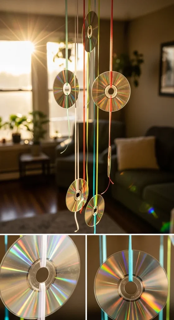 Old CDs and DVDs may no longer be useful for music or files, but their reflective surface makes them perfect for sun catchers. You can leave them whole, paint simple designs on them, glue on beads, or cut paper shapes to create layered patterns. Hang them with ribbon or fishing line near a sunny window and let the light bounce around the room. This is an easy and inexpensive craft that feels cheerful right away. It is also a nice one for kids because the sparkle is instantly rewarding. If the disc surface is scratched, that often adds even more texture once sunlight hits it. Grouping several together can create a fun curtain effect in a window or balcony door. The project uses very few supplies and gives old discs a second life as something decorative instead of forgotten. Recycled sun catchers are simple, bright, and a good reminder that even outdated tech can still become something pretty.