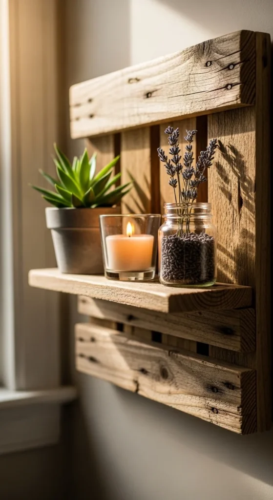 If you can get safe, clean pieces of pallet wood, they can become charming mini shelves for plants, jars, or small decor. Sand the wood, cut it to size, and nail or screw together a basic shelf shape. Keep the finish natural for a rustic look, or paint it if you want something more polished. This project takes a little more effort than paper or jar crafts, but it is still budget friendly because reclaimed wood often costs nothing. Small shelves are useful in bathrooms, kitchens, or entryways where extra storage always helps. Even one simple shelf can hold a tiny plant, candle, or storage jar and make a blank wall feel more finished. If you do not want to build from scratch, you can attach a single pallet board with brackets for an easier version. Reusing wood like this feels sturdy and lasting, and it gives rough leftover material a much nicer second purpose in the home.