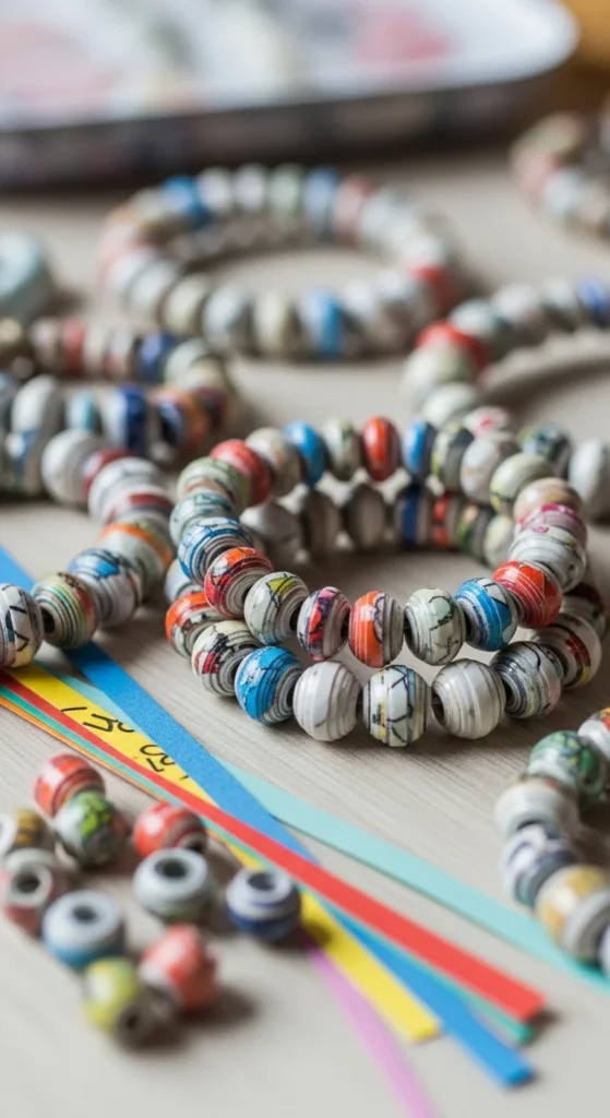 Scrap paper from magazines, wrapping paper, or old notebooks can be rolled into beads for colorful jewelry. Cut long triangle strips, roll them tightly around a skewer, glue the end, and seal the bead with clear glue or varnish once dry. Then string the beads into bracelets, necklaces, or simple garlands. This is a fun project because the paper patterns create lots of variety, and even small scraps can be used. It is perfect for kids, teens, or anyone who likes lightweight jewelry with a handmade feel. The project costs very little, especially if you already have elastic cord or string at home. You can mix paper beads with plain wooden beads or buttons if you want more texture. A set of matching bracelets also makes a sweet handmade gift. Recycled jewelry crafts show that paper does not have to stay flat to be useful. With a bit of rolling and sealing, it can become wearable art that feels bright, personal, and low-cost.