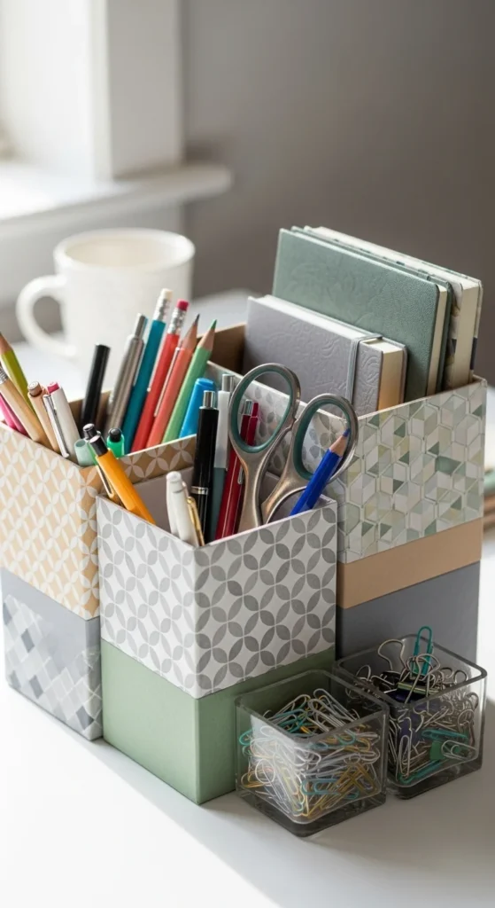 Small cardboard boxes from tea, cereal, soap, or online orders can be turned into useful desk organizers in a short afternoon. Start by cutting the boxes into the shapes you want. You can make pen holders, mail slots, or tiny trays for clips and notes. Cover the outside with wrapping paper, leftover wallpaper, magazine pages, or plain paint to hide the printed packaging. Glue several boxes together on a flat cardboard base if you want a full organizer set. This is a good project for home offices, study tables, or kids’ homework stations because it helps reduce clutter while reusing materials you already have. The low-cost part is what makes it so appealing. Instead of buying plastic organizers, you can make custom storage that fits your exact drawer or desk space. Neutral paper gives a clean look, while bright scrapbook pieces make it cheerful. You can even add labels later if you want. It is a smart recycled craft because it solves a real problem and gives packaging waste a second purpose in a neat, useful form.