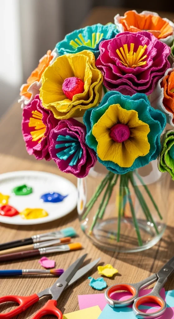 Egg cartons are perfect for flower crafts because the little cup shapes already look like petals waiting to happen. Cut the cups apart, trim the edges into rounded or pointed petal shapes, and paint them in bright or soft shades depending on the look you want. Once dry, glue them onto sticks, paper straws, or floral wire. Add button centers, small beads, or rolled paper in the middle for detail. Then arrange the finished flowers in a recycled jar or can for a cheerful bouquet that lasts much longer than real blooms. This is a great craft for children because it is simple, colorful, and forgiving. It is also very affordable since most of the materials come from your recycling bin. You can use the flowers for table decor, teacher gifts, party centerpieces, or spring displays around the house. Even plain brown cartons can look beautiful once painted. A bunch of these in mixed colors feels playful and handmade in the best way. It is a fun reminder that packaging can become decor instead of trash.