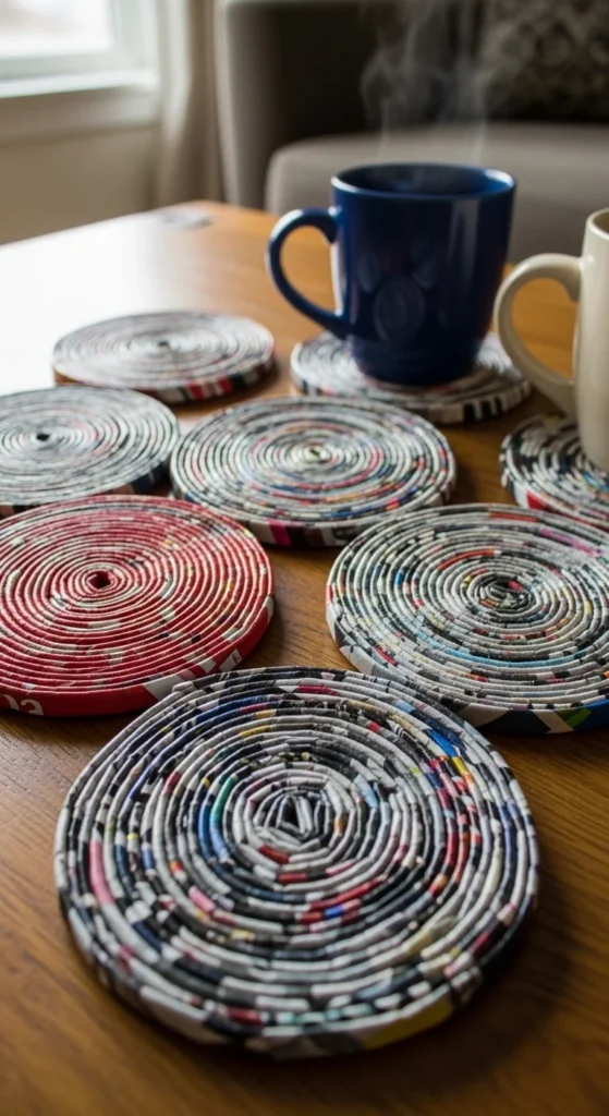 Old magazines are full of color, which makes them perfect for paper coasters. Tear or cut the pages into long strips, then roll, fold, or weave them into round or square shapes. Glue each layer in place as you go and finish with a coat of clear sealer if you want extra strength. These coasters are a fun way to use glossy pages that would otherwise go in the bin, and they let you play with color combinations without buying new materials. If you sort pages by color first, you can create sets that feel more planned and polished. This project works well for older kids, teens, or adults who enjoy simple repetitive crafts. It is cheap, relaxing, and useful once finished. You can keep the style bright and mixed, or choose mostly neutral pages for a calmer look. A tied stack of handmade coasters can even work as a small gift. It is one of those recycled crafts that turns paper waste into something both decorative and practical for everyday living.