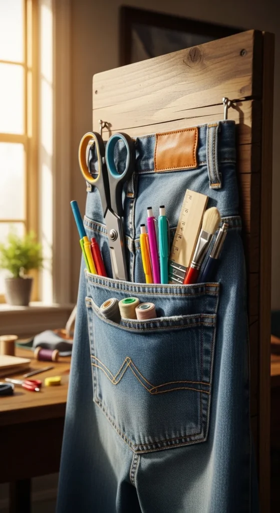 Old jeans are full of strong fabric that can still be useful even when the knees are worn or the fit is no longer right. The back pockets are especially handy for storage crafts. Cut the pocket area from the jeans, leaving enough fabric around each one to attach it to a larger backing piece. Then sew or glue the pockets onto a strip of denim, canvas, or thick fabric. Hang the finished piece on a wall or the side of a desk to hold craft tools, mail, cords, or small notebooks. This is a great project because the material is strong, washable, and already has built-in compartments. It works well in sewing spaces, children’s rooms, or entryways where little things tend to pile up. The cost stays low because old jeans provide most of the structure. You can keep the raw edges for a casual look or trim them neatly if you want it cleaner. Reusing denim like this is practical and gives worn clothing a second life in a form you will actually use.