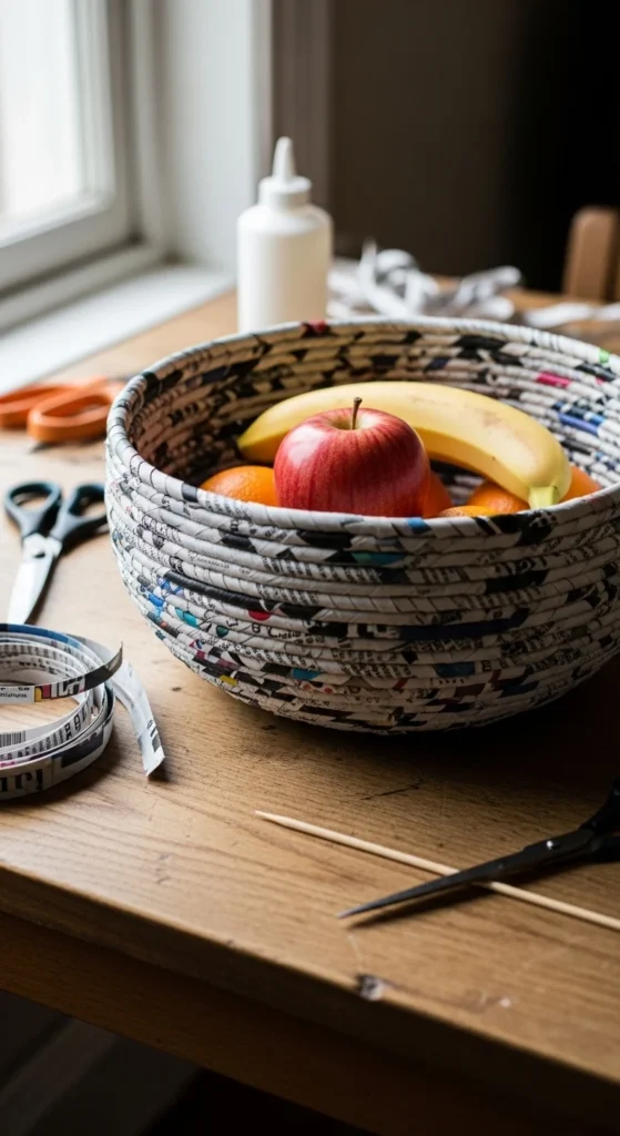 Newspapers can be turned into woven bowls and baskets that are much sturdier than they first appear. Roll each sheet tightly around a skewer or thin stick, glue the end, and make a large pile of paper tubes. Then weave or coil them into shape, securing sections with glue as you go. Once finished, paint the bowl in one solid color or stain it lightly for a more natural look. This craft takes a little more time than some simpler ideas, but it still uses cheap materials and basic tools. It is a good weekend project if you want something useful at the end. Small paper bowls can hold keys, dry decor, mail, or wrapped snacks. They look especially nice on open shelves or entry tables. Saving old newspapers for a few weeks gives you enough material without spending anything. If you want more strength, add a coat of sealer. It is a clever way to turn stacks of old paper into woven home storage that feels handmade and thoughtful.