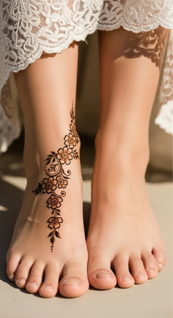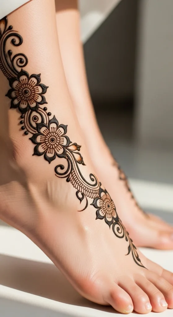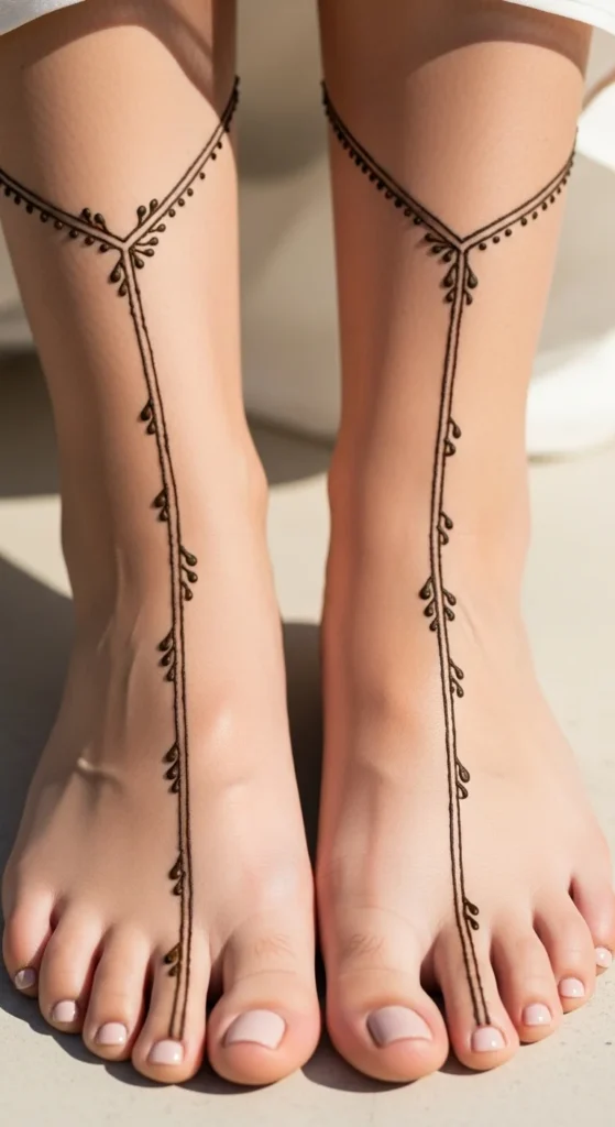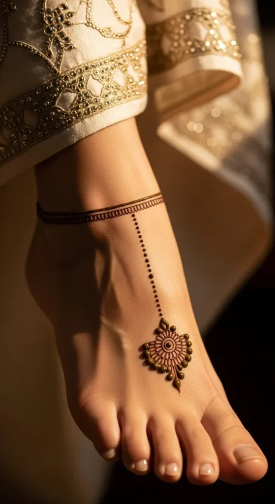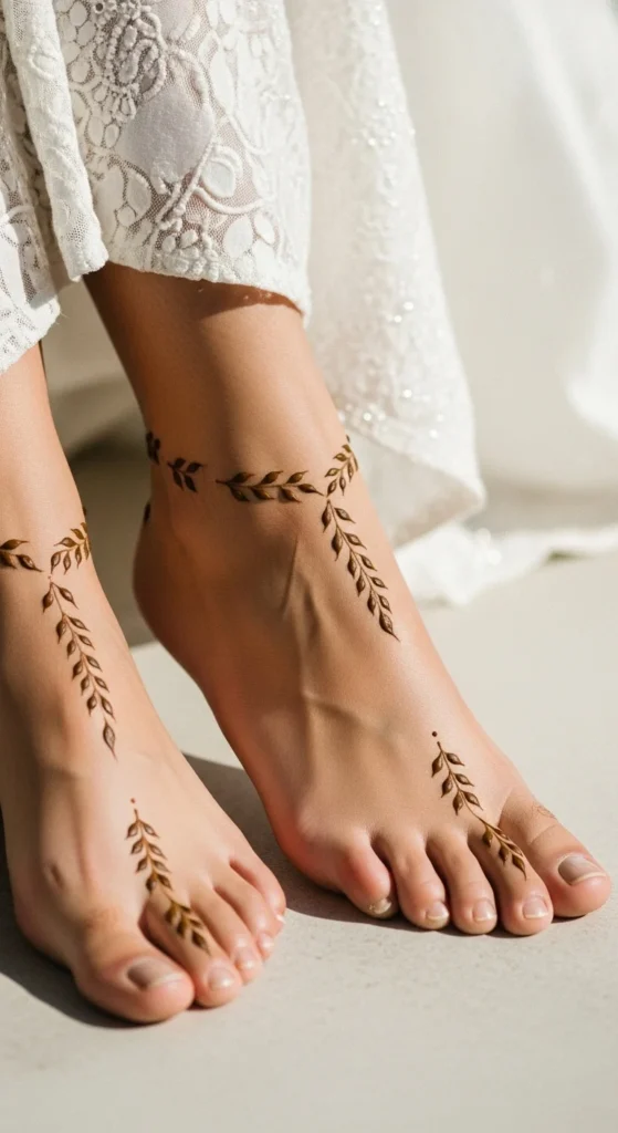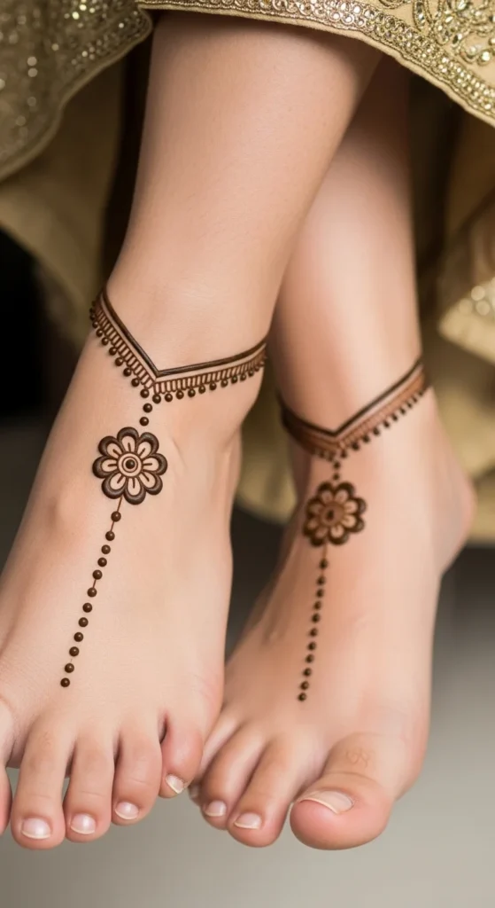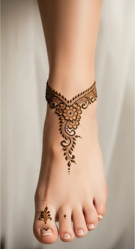 A delicate anklet band is one of the easiest ways to get an elegant foot mehndi look without filling too much space. The design usually wraps around the ankle like jewelry, using tiny petals, dots, chain links, or scalloped curves. This style works well because it gives a polished finish while keeping the rest of the foot mostly open. That empty space is what makes the design feel modern and light. If you are doing mehndi at home, this is a budget-friendly option because it uses less cone work and takes less time than a full-foot design. You can keep it very simple with one thin band and a few hanging drops, or add tiny toe dots to connect the look. It pairs beautifully with sandals and heels since the ankle becomes the focus. Brides can make it slightly fuller, while guests can keep it thin and neat. This design is also practical if you do not want too much henna touching the sole or upper center of the foot. It feels stylish, balanced, and very wearable for weddings, dinners, or festive events.