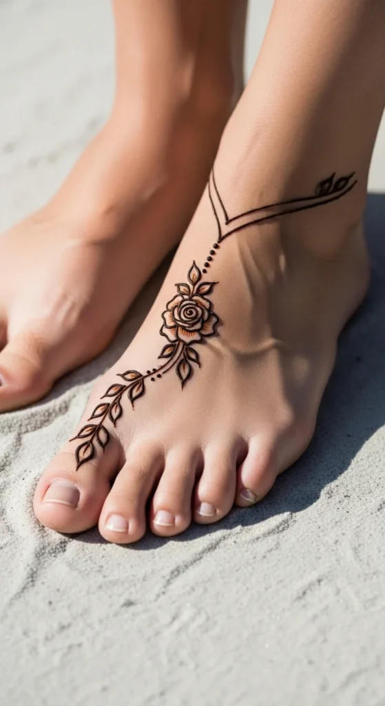 A rose and short trail design is charming, classic, and very easy to adapt for a minimal look. The rose can sit near the big toe base or side of the foot, with a short trail of leaves or dots moving upward. This layout keeps the design focused in one area, which makes it look clean and balanced. Roses work well in mehndi because their layered petal shape already feels decorative, so even one flower can make a strong impression. This is a nice budget-friendly option for DIY mehndi at home because you can build the flower with simple curved petals and avoid fine filling work. If you want a softer version, make the rose small and keep the trail delicate. If you want a bridal effect, add two tiny buds and a few drop shapes near the ankle. This design is very wearable with lehengas, shararas, sarees, and even simpler festive outfits. It adds just enough detail without making the foot look busy. Since the pattern is compact, drying and moving around also becomes easier. The final effect is sweet, polished, and timeless in a way that always looks graceful.