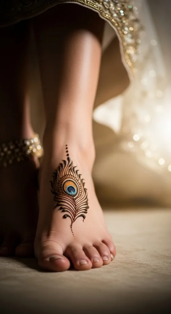 A tiny peacock accent is a nice choice for someone who wants a slightly traditional motif without going for a full heavy design. The peacock can be kept very small and placed near the side of the foot, ankle, or upper corner so it feels like an accent rather than the whole story. You can simplify it by focusing on the curved neck, feather eye, and a few elegant lines instead of a fully detailed bird. This makes it much easier for home application and helps the design stay minimal. A tiny peacock works well for weddings because it still carries that classic festive feel, but it also suits smaller family functions when done lightly. Pair it with a few dots or one leaf spray so it does not look isolated. Since the shape already has personality, you do not need much around it. This also helps if you want faster drying and less chance of smudging. The pattern looks lovely from side angles and works especially well with traditional outfits. The overall feel is graceful and a little regal, while still staying neat enough for someone who prefers lighter mehndi on the feet.