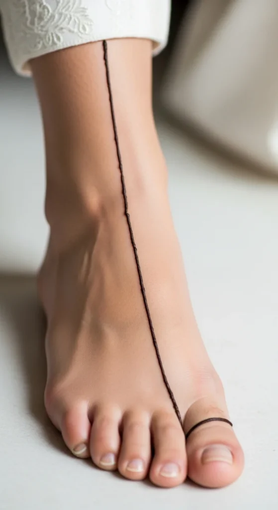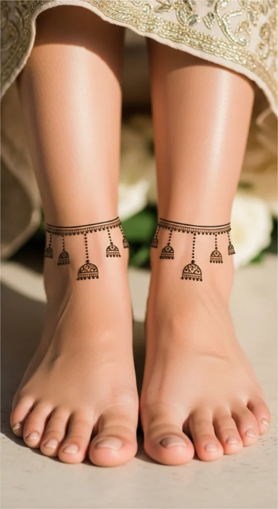 A jhumka-inspired anklet design adds a festive twist to minimal foot mehndi by making the pattern look like tiny hanging earrings or charms around the ankle. The base stays light, usually as a thin curved band, while the charm details hang below in droplet, bell, or petal forms. This gives the design movement and a jewelry-like finish without needing to cover much of the foot. It is a lovely option for wedding events because it feels dressy but still airy. At home, you can start with one slim band and then add two or three hanging motifs spaced apart. That is often enough to create the effect. Keep the hanging details small so the pattern does not become too heavy. This style works beautifully with lehengas and traditional sandals, especially when the ankle area is visible. It also suits bridesmaids who want something slightly more special than a plain band. Since the top center of the foot stays open, the mehndi remains comfortable and less messy. The final look is elegant, festive, and very pretty in motion, especially when walking or posing with slightly lifted heels.