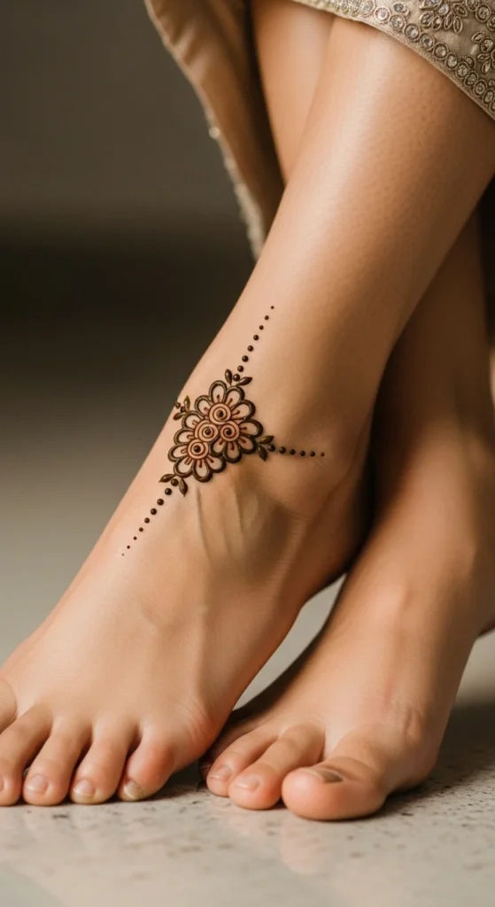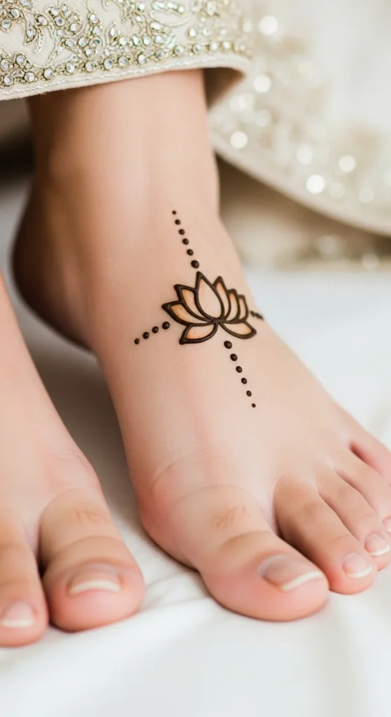 A single lotus accent is a beautiful option when you want something symbolic, graceful, and very clean. The lotus can be placed near the ankle, on the upper side of the foot, or at the center if you want a stronger focal point. Because the flower shape already has presence, you do not need much else around it. A few dots, tiny leaves, or a small curved base line are enough to complete the design. This makes it perfect for people who like spiritual or floral motifs but still want a minimal finish. It is also easy to adapt based on skill level. A beginner can draw a basic lotus with layered petals, while someone more experienced can add fine line shading or small side buds. This design saves time, uses less mehndi, and still looks thoughtful in photos. It works especially well with ethnic outfits that already have detail, since the mehndi stays simple and does not compete. If you want a bridal version, add a light anklet band above the lotus. If you want something more casual, keep the flower alone. The result is calm, pretty, and very easy to wear.