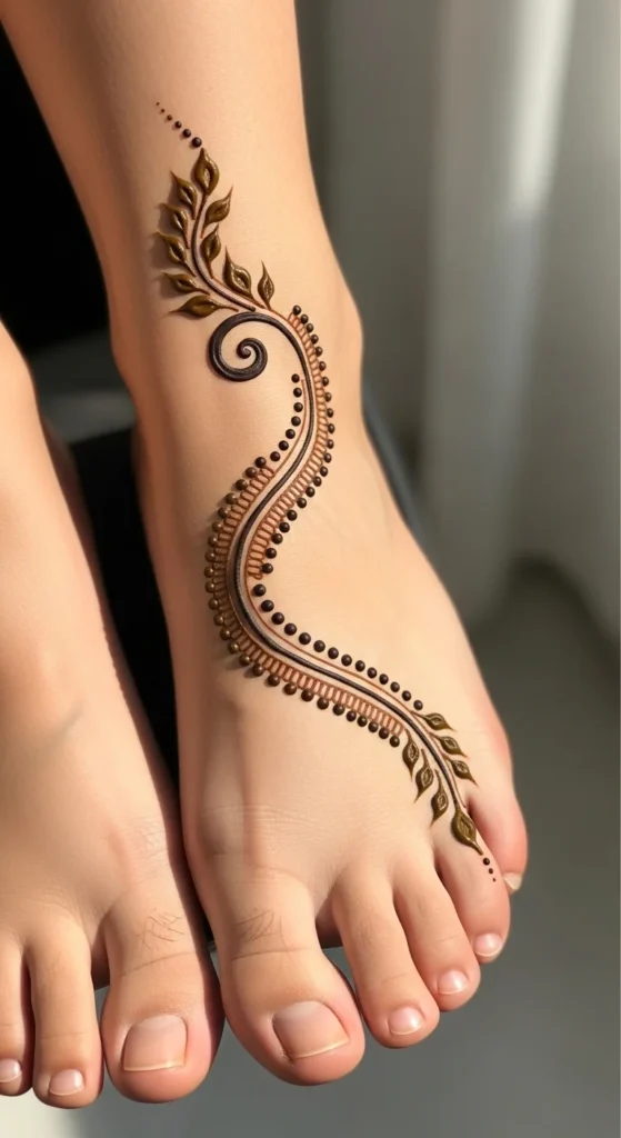 A curved swirl with dots is one of the simplest mehndi ideas you can try, yet it can still look very graceful when placed well. The design starts as one flowing curve from the toe base, side of the foot, or ankle and then gets finished with dot trails, tiny leaf tips, or miniature petal shapes. Since the main line does most of the visual work, the rest can stay very light. This is a great choice for beginners because it does not require full motif building or dense detailing. You only need one confident curve and a few neat finishing touches. It is also very budget-friendly and fast, which makes it suitable for small events, last-minute plans, or anyone testing mehndi at home for the first time. If you want a modern look, keep the swirl long and clean with minimal extras. If you want something a little softer, add two tiny buds near the end. This design pairs well with plain toes and open sandals. The final effect is graceful and understated, proving that a small amount of mehndi can still make the foot look dressed and festive.