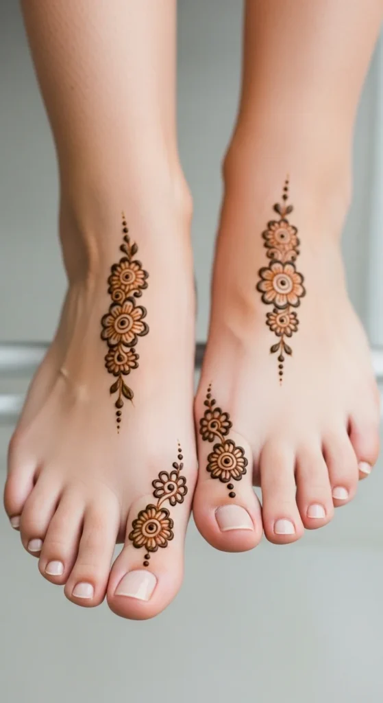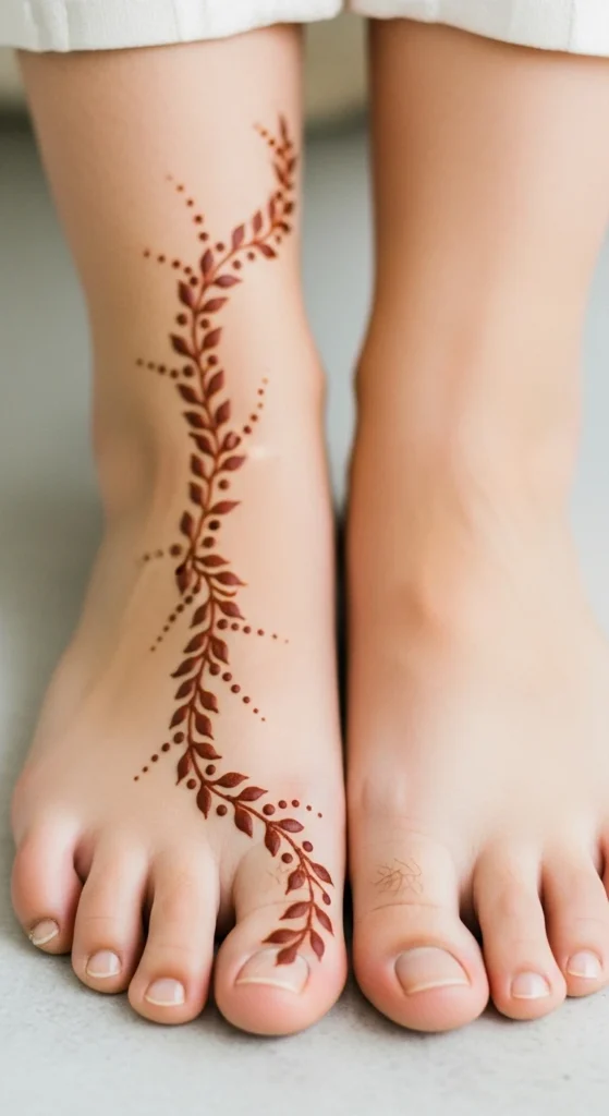 A diagonal leaf trail creates a graceful line across the foot and is one of the easiest ways to make a minimal mehndi design look intentional. The pattern begins near the big toe or toe base and moves upward diagonally with tiny leaves, buds, and dotted turns. Since the design follows a clear path, it looks neat and balanced even when the elements stay simple. This is also a very friendly style for beginners because you can draw one guide line first and build along it slowly. Use small leaves for a softer look or mix one or two mini flowers for more detail. The open areas around the trail help the mehndi stand out without making the foot look crowded. That is what gives it a clean, elegant finish. A diagonal trail is a lovely choice for bridesmaids and younger girls because it feels pretty without looking too formal. It also works well if you want something quick for a last-minute event. Pair it with matching toe dots or leave the toes plain for an even more modern result. The final look feels delicate, smart, and easy to style with both flats and heels.
