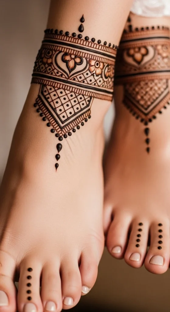 A geometric panel accent is a great way to bring a modern touch into foot mehndi while keeping the overall look minimal. The design uses small sections of clean lines, angled shapes, net details, or repeating curves arranged in a narrow panel near the ankle or upper side of the foot. This style feels neat and fashion-forward because the geometry keeps the layout controlled. It is especially nice for people who want something different from florals but still want the design to feel festive. At home, you can simplify the panel by using a few straight bands, tiny diamonds, and dot borders. There is no need to make it very dense. The empty spaces between shapes are what keep it elegant. This pattern works well with plain toes or one small matching toe detail. It is also a good option for events where you want a stylish mehndi look that feels more modern than traditional. Brides can make the panel slightly longer for more impact, while guests can keep it short and tidy. The result looks sharp, clean, and very current without being loud or difficult to wear.