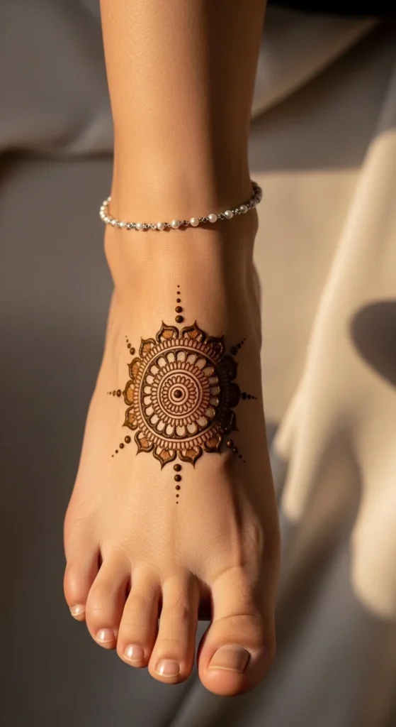 A small center mandala is a classic foot mehndi design that feels elegant without looking crowded. The pattern sits in the middle of the foot and uses a circular flower, petal ring, or dotted wheel shape to draw attention to that area. Since the design stays compact, it gives a refined look that works for bridal events, Eid, or family functions. The best part is that a single mandala can look complete on its own. You do not need to fill every corner of the foot to make it stand out. This makes it a smart low-effort option if you want something graceful with shorter sitting time. At home, you can make it with one flower center, a ring of petals, and a few dots around the edges. If you want a little more drama, add one short vine running toward the ankle. A small center mandala also photographs beautifully because the pattern looks balanced from a top view. If your outfit is already heavy, this mehndi style keeps things calm and polished. It gives that minimal but dressed-up effect that so many people want for modern festive styling.