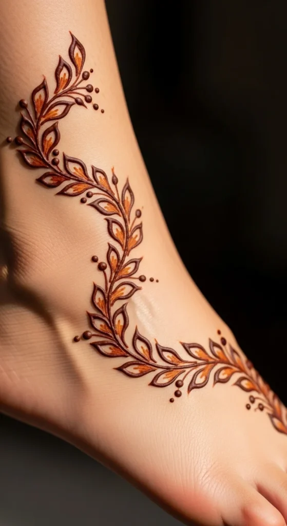 Scattered leaf sprigs are perfect when you want mehndi that feels soft, organic, and not too formal. Instead of one connected design, the pattern uses a few small leaf clusters placed across the ankle, toe side, or upper foot with space between them. This gives the foot a very airy and balanced appearance. It is one of the easiest styles to do at home because each sprig can be drawn separately, which means you do not have to worry too much about perfect flow. A few small leaves, short stems, and tiny dots are enough to create a pretty result. This design is very budget-friendly and quick, making it a good option for casual festive days or last-minute plans. It also works nicely for people who do not like heavy symmetry. Since the placement is light, it pairs well with printed outfits, embroidered footwear, or existing jewelry. Brides can make the sprigs slightly denser near the ankle, while guests can keep them sparse and tiny. The final look feels natural, elegant, and very wearable. It is proof that simple mehndi can still look thoughtfully styled without needing dense fills or long sitting time.