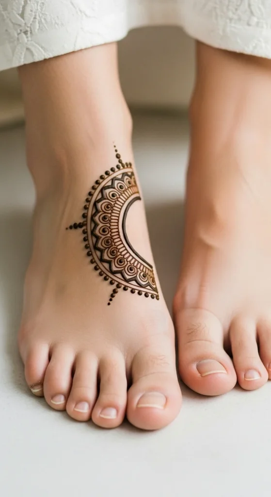 A half mandala curve is a smart design when you want the beauty of a mandala without the fullness of a center circle. Instead of placing the pattern in the middle, the half shape sits on one side of the foot and opens outward with petals, scallops, and dots. This makes the layout look airy and stylish. It also helps the foot appear longer because the lines follow the natural shape instead of stopping it visually. This style is a good pick for modern brides, sisters, or guests who want something more artistic than a plain floral vine. At home, the easiest method is to start with a semicircle and build petals outward in layers. Leave some gaps between shapes so the pattern does not feel heavy. That spacing is what gives the design its clean elegance. You can pair this with plain toes or add one tiny motif on the big toe for balance. The design also works well for people who do not want too much henna in the center where footwear straps may sit. It looks refined, fashionable, and easy to adapt for both weddings and smaller festive events.