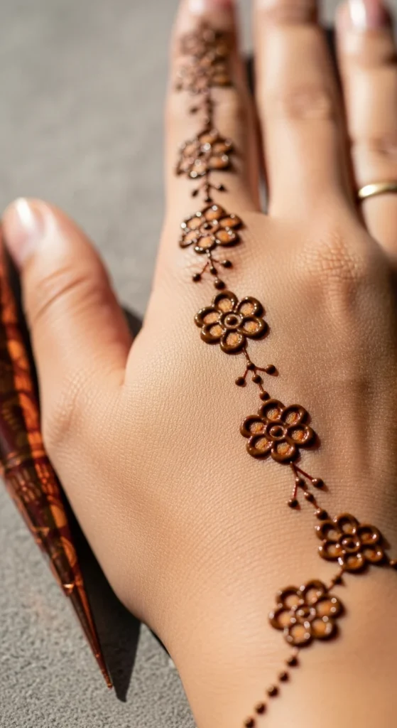 A tiny flower chain is perfect when you want something pretty without filling your whole hand. Start by drawing one small circle and add five rounded petals around it using short, curved strokes. Keep your lines thin and don’t worry if the petals aren’t identical. Mehndi looks natural with slight variation. From one side of the flower, draw a gentle curved line and place another small flower at the end. Repeat this pattern to form a soft trail across the hand or wrist. Add tiny dots around the flowers to fill empty spaces and hide small gaps. Rest your elbow on a table to steady your hand while working. This design dries quickly and is easy to extend if you want more coverage later.