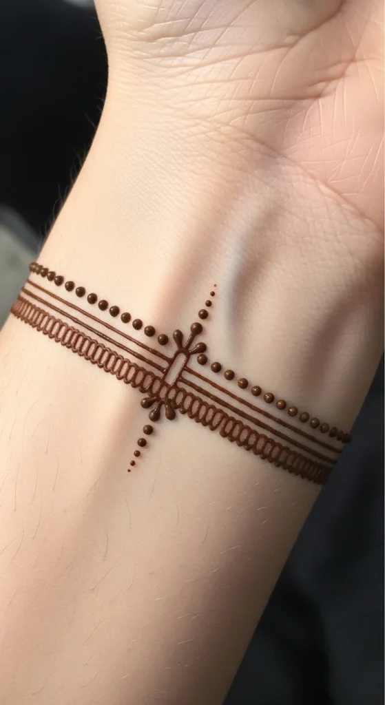 A wrist band design is quick and looks like a piece of jewelry. Draw one thin line around your wrist like a bracelet. Keep your hand relaxed and rotate your wrist instead of moving the cone too much. Once the main band is drawn, add a row of tiny dots just above the line and another row below it. These dots frame the band and make it look decorative. If the line looks wavy, don’t worry. The dots help distract from small imperfections. You can also add short vertical strokes crossing the band in one small section to create a clasp-like detail. This design takes only a few minutes and pairs nicely with real bangles. It is perfect for beginners because straight lines are easier to control when drawn slowly with light pressure.