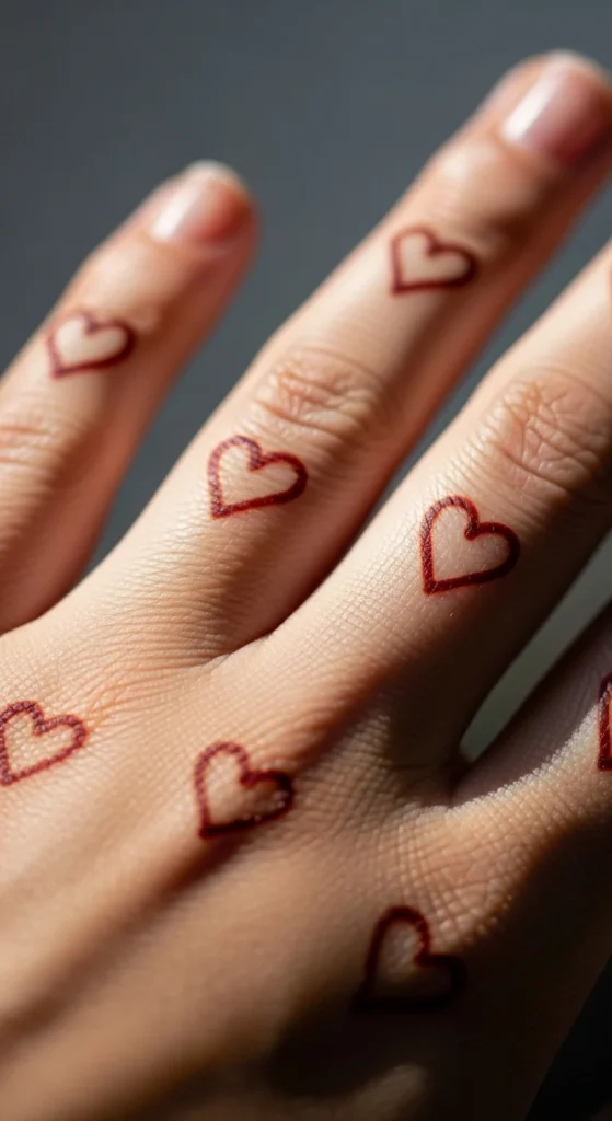 Tiny heart motifs are playful and simple for beginners. Start by drawing a small “V” shape. Then round the top edges to turn it into a heart. Keep each heart small so the design looks neat. Place a few hearts along the side of a finger or near the wrist. Leave space between them so the pattern doesn’t feel crowded. You can connect two hearts with a line of tiny dots for extra detail. If your lines look shaky, outline the heart once more to smooth the shape. Hearts dry fast and are easy to practice on paper first. This design works well for casual wear or younger girls who want something cute and light.