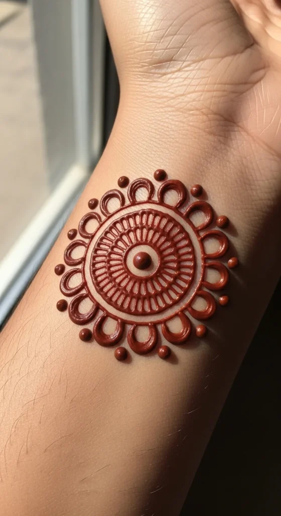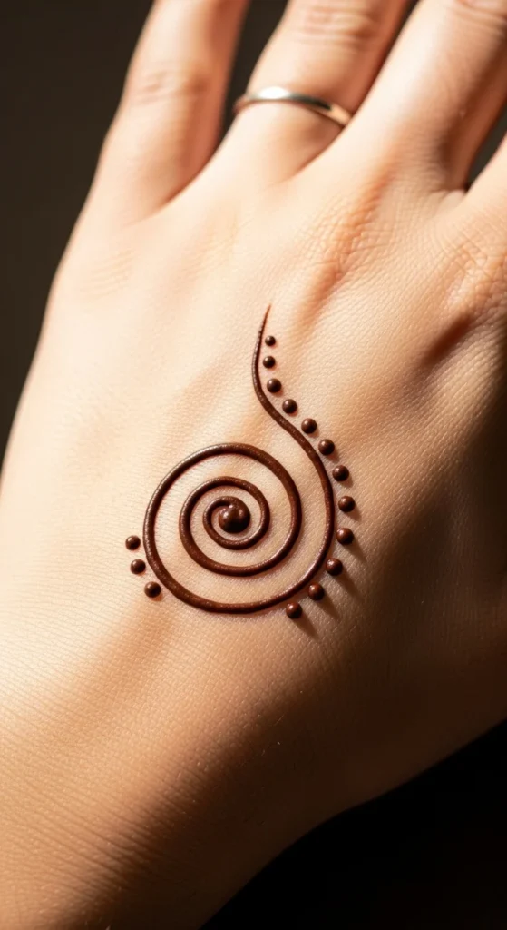 A spiral swirl is one of the easiest shapes to draw with a mehndi cone. Start with a tiny curve and slowly circle outward in a smooth motion. Keep the spiral loose rather than tight. Once the spiral is complete, add a few dots around it to fill the surrounding space. You can place this design on the back of your hand, near the thumb area, or on the wrist. If the spiral looks uneven, add a thin outline around it to make it look bolder and more intentional. This design is quick, modern, and very forgiving for beginners learning hand control.