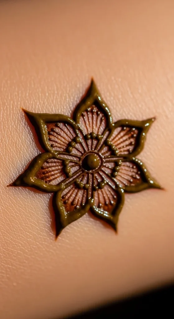 A small mandala in the center of the palm is one of the easiest classic designs. Begin with a tiny circle in the middle of your palm. Around it, add a ring of evenly spaced dots. Next, draw small petal shapes around the dots, like a sun with soft rays. Keep each petal short and rounded. Add another outer ring of dots to frame the shape. The key is spacing, not perfection. Turn your hand slightly as you work so your wrist stays relaxed. If lines look uneven, add more dots to balance the design visually. This style looks neat, dries fast, and works well for festivals or casual outings.