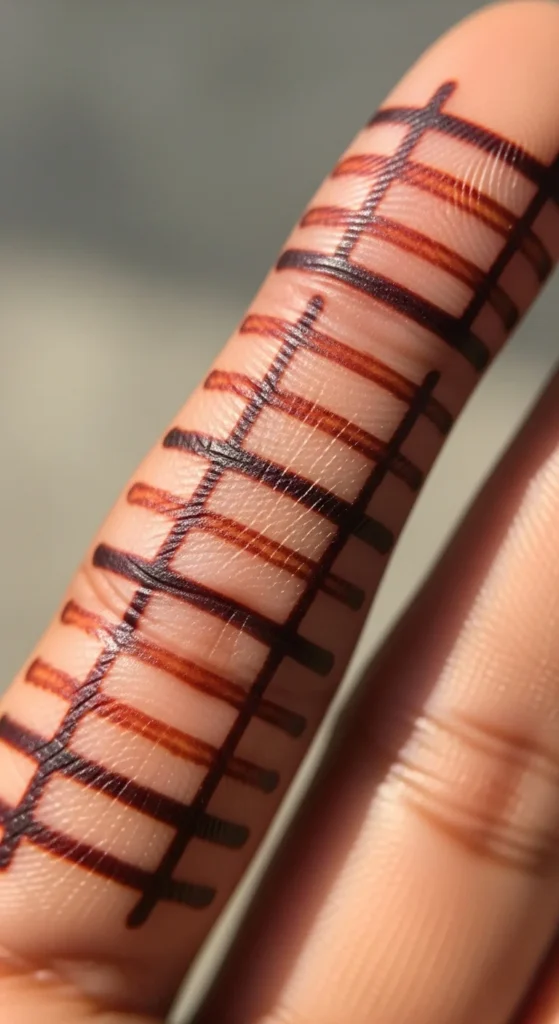 The finger ladder pattern is modern and very simple. Draw thin horizontal lines across one finger, leaving small gaps between each line. Then connect them with short vertical strokes on one side to create a ladder look. Keep the strokes light and straight. If lines wobble, add tiny dots at the corners to make them look decorative. This design works best on the middle or ring finger and pairs nicely with other small hand designs.