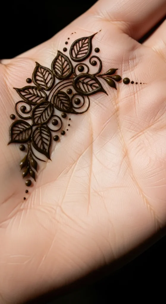 A leaf cluster fills a small space beautifully. Choose one corner of your palm and draw a short curved stem. Add small leaf shapes along the stem using teardrop strokes. Keep the leaves pointing outward. Fill tiny gaps with dots to make the cluster look fuller. This is a great filler design and easy to expand if you want more detail later.