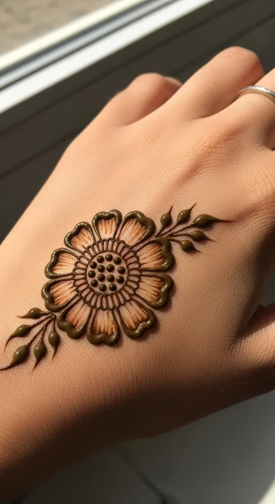A small sunflower design looks bold but is made from very easy shapes. Start by drawing a medium circle. Fill the inside with tiny dots placed close together. This creates a textured center. Around the circle, draw short rounded petals going all the way around. Keep the petals similar in size but don’t stress about perfect spacing. Mehndi flowers look natural with small variations. Once the petals are done, you can outline the entire flower with a thin border to make it stand out more. Add a few dots around the outside if the area feels empty. This design works well on the back of the hand, near the wrist, or even as a finger accent. Because it uses repeated strokes, it helps beginners practice steady pressure and control while still creating a design that looks full and eye-catching.