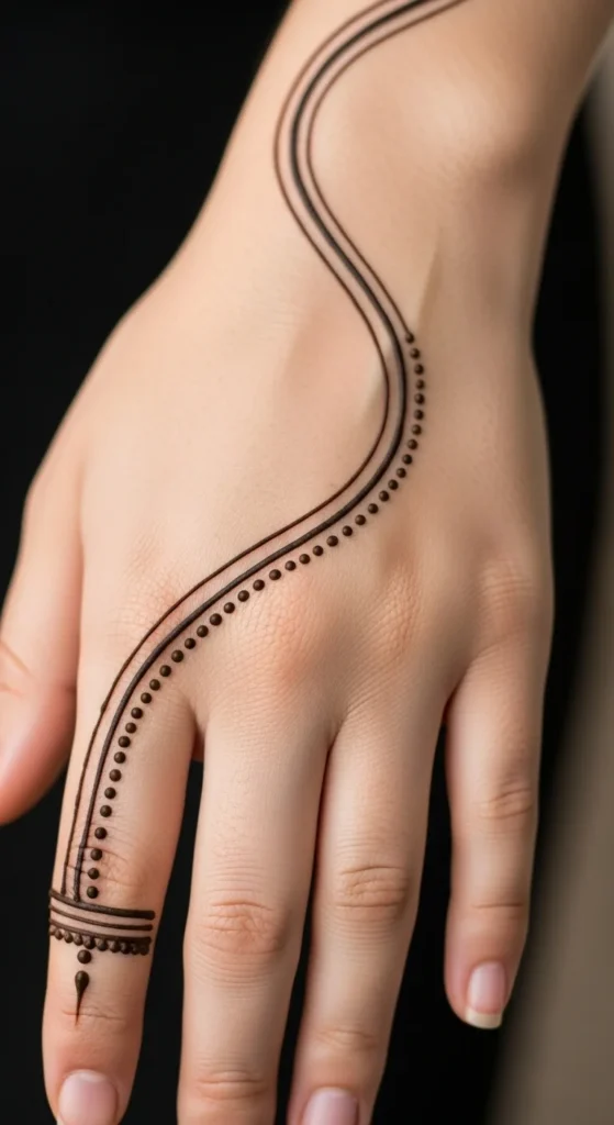 The double line curve is simple, neat, and elegant. Begin by drawing one thin curved line across your hand. Move slowly and keep your wrist relaxed. Once the first line is complete, draw a second line right beside it following the same path. Try to keep the spacing between the lines even. If the lines are not perfectly smooth, don’t worry. You can add tiny dots between them to decorate the space and distract from small wobbles. This design looks great along the side of the hand or sweeping diagonally across the back of the hand. It is quick to apply and pairs nicely with other small patterns like flowers or leaf vines. Practicing long curved strokes like this helps improve control with the mehndi cone.