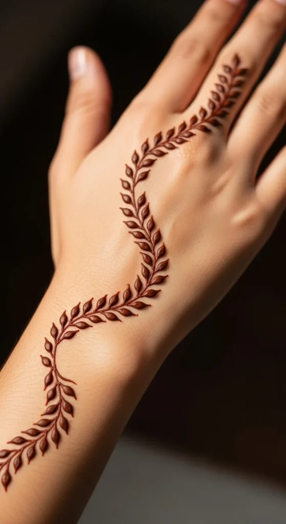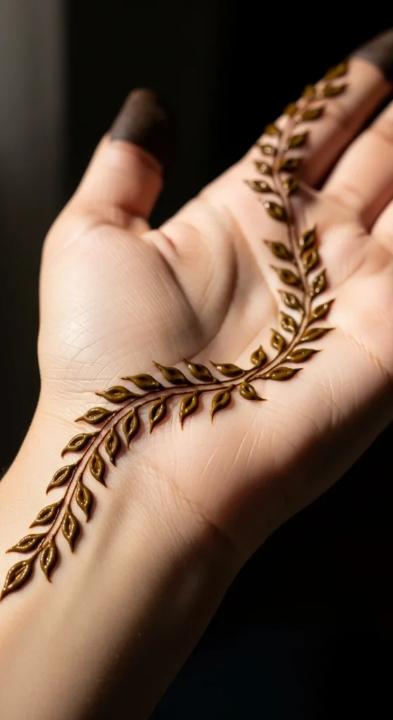 A side palm vine adds detail without covering the entire hand. Start near the base of your palm and draw a thin curved line following the outer edge toward your little finger. This becomes the stem of the vine. Along the stem, add small leaf shapes using short teardrop strokes. Alternate the direction of the leaves to make the vine look natural. Keep the leaves small and evenly spaced. If there are empty gaps, fill them with tiny dots. This design is very forgiving because vines naturally curve and flow. It works well on its own or combined with a small wrist band or finger design. Beginners like this pattern because it uses simple shapes and doesn’t require symmetry on both sides.