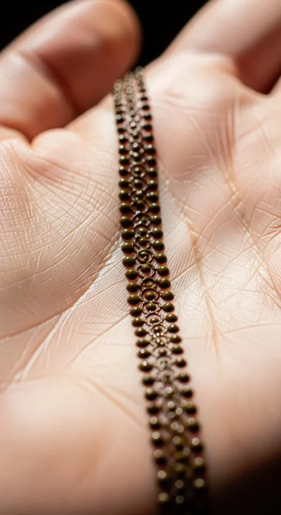 This design looks like a hand chain accessory. Draw a thin band around one finger like a ring. From the center of that band, create a straight line of evenly spaced dots going down toward the wrist. You can end the line with a small flower or circle. The dots don’t need to be perfect. Even spacing matters more than size.