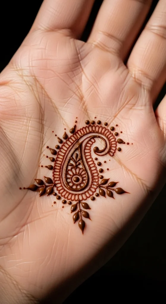 A paisley corner accent fills an empty space beautifully. Choose one corner of your palm and draw a small curved mango shape. Outline it once more to make the border bold. Inside the paisley, add a few short curved lines that follow the same direction as the outer shape. Around the paisley, place tiny dots and small leaf shapes to complete the look. This design is easy to expand if you want to add more later. Paisleys are forgiving because their curved form hides small line mistakes. It works well as a starting point for a larger design or as a small standalone detail.