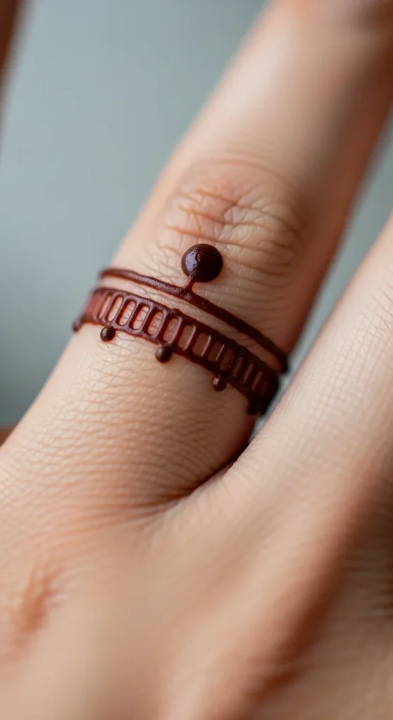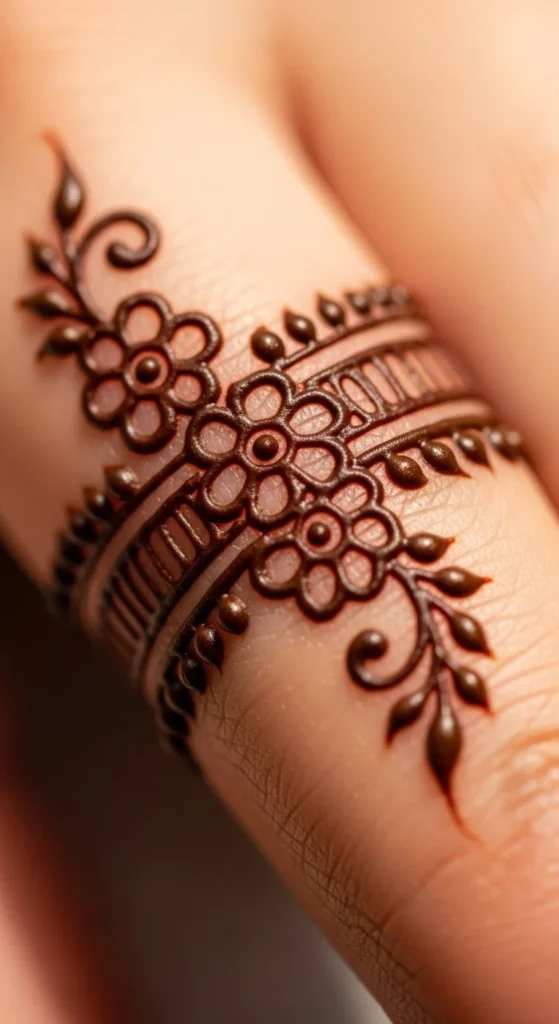 Draw a thin band around one finger. Add a small flower or dot cluster on top of the finger. Connect it with a thin line to the band. It looks like a delicate ring made of henna and takes just minutes.