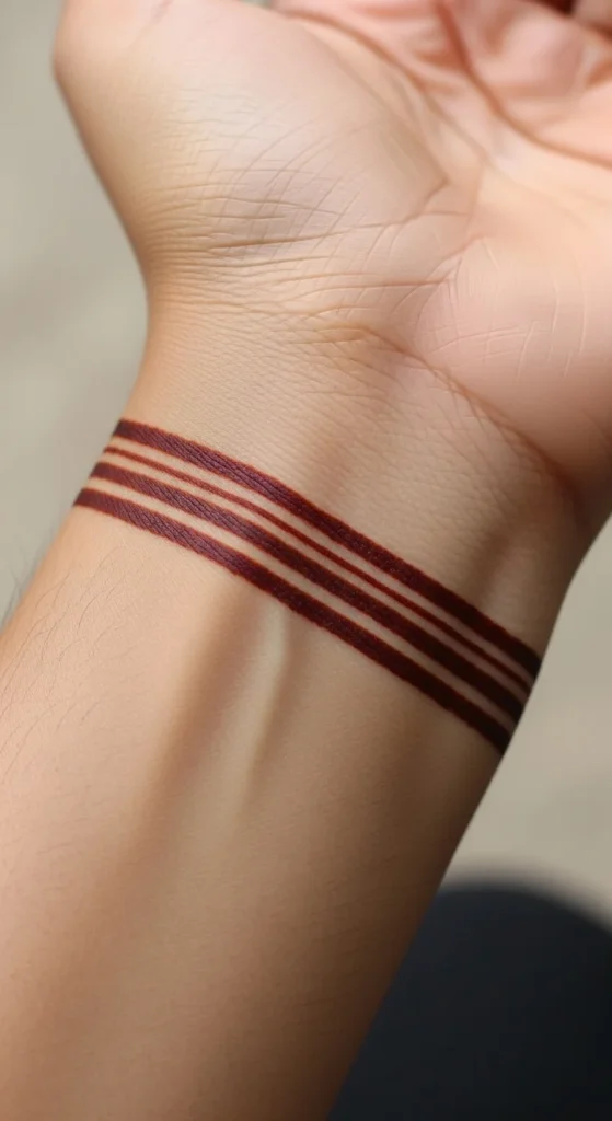 A bracelet design is simple and stylish. Draw three thin parallel lines around your wrist like a bangle. Keep space between each line equal. If a line wobbles, add tiny dots along it to make it look decorative. You can connect the lines with short vertical strokes in one section to create a clasp effect. This design is quick, neat, and easy to match with real jewelry.