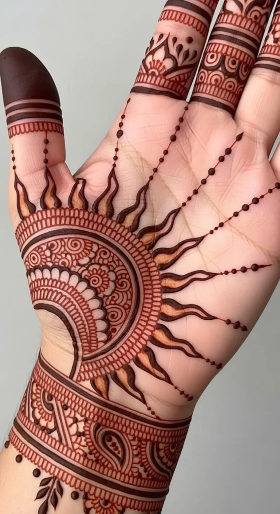 Place a half circle at one corner of your palm. Add short lines radiating outward like sun rays. Fill gaps with dots. This off-center design looks balanced without covering the full palm.