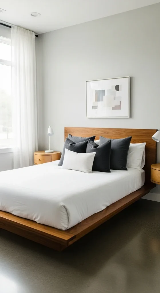 A platform bed sets the tone for a sleek modern bedroom. Its low height keeps the room grounded and visually calm. Clean edges work better than ornate frames. Choose wood or upholstered designs in neutral tones for flexibility. If replacing the bed isn’t possible, remove bulky bed skirts and keep linens tailored. This instantly sharpens the look. Platform beds also pair well with minimal nightstands, helping the whole layout feel intentional rather than crowded.