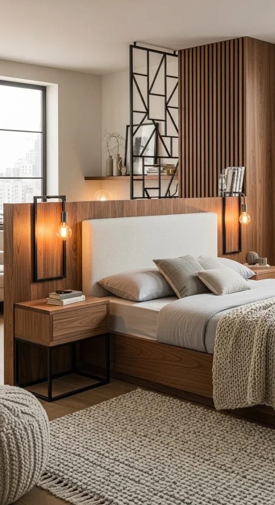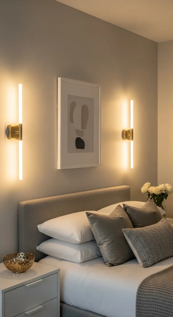 Slim sconces replace bulky bedside lamps and free up surface space. This keeps nightstands clean and functional. Plug-in or rechargeable versions make installation easier. Choose simple shapes with warm bulbs. Position them at shoulder height when seated in bed. This provides useful light without glare. Fewer objects around the bed improve the room’s clarity.